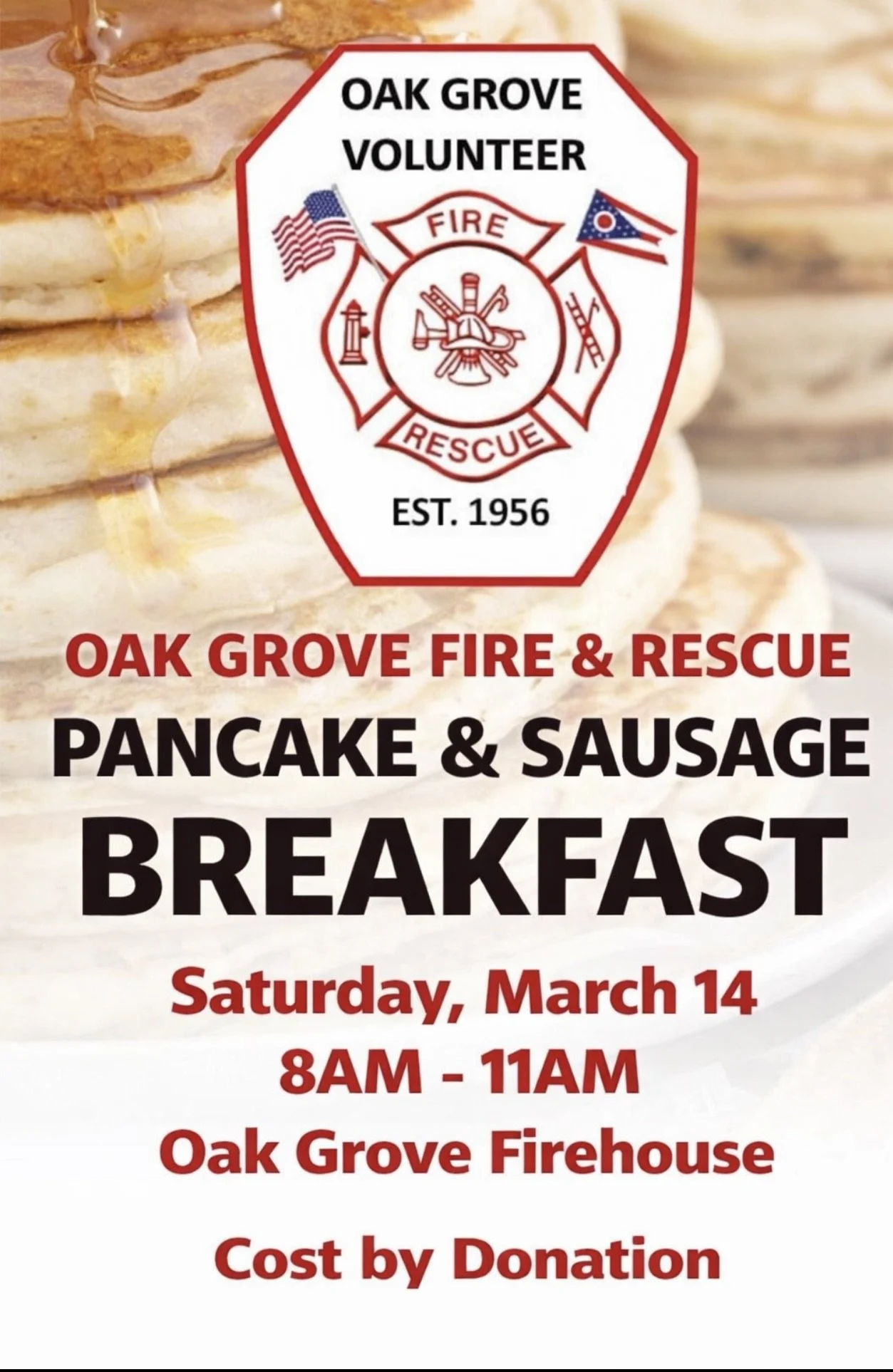 Back to All Events Oak Grove Fire & Rescue Pancake & Sausage Breakfast Saturday, March 14, 2026 8:00 AM 11:00 AM Oak Grove Fire Department 102 Oak Grove Lane Marietta, OH, 45750 United States (map) Google Calendar ICS