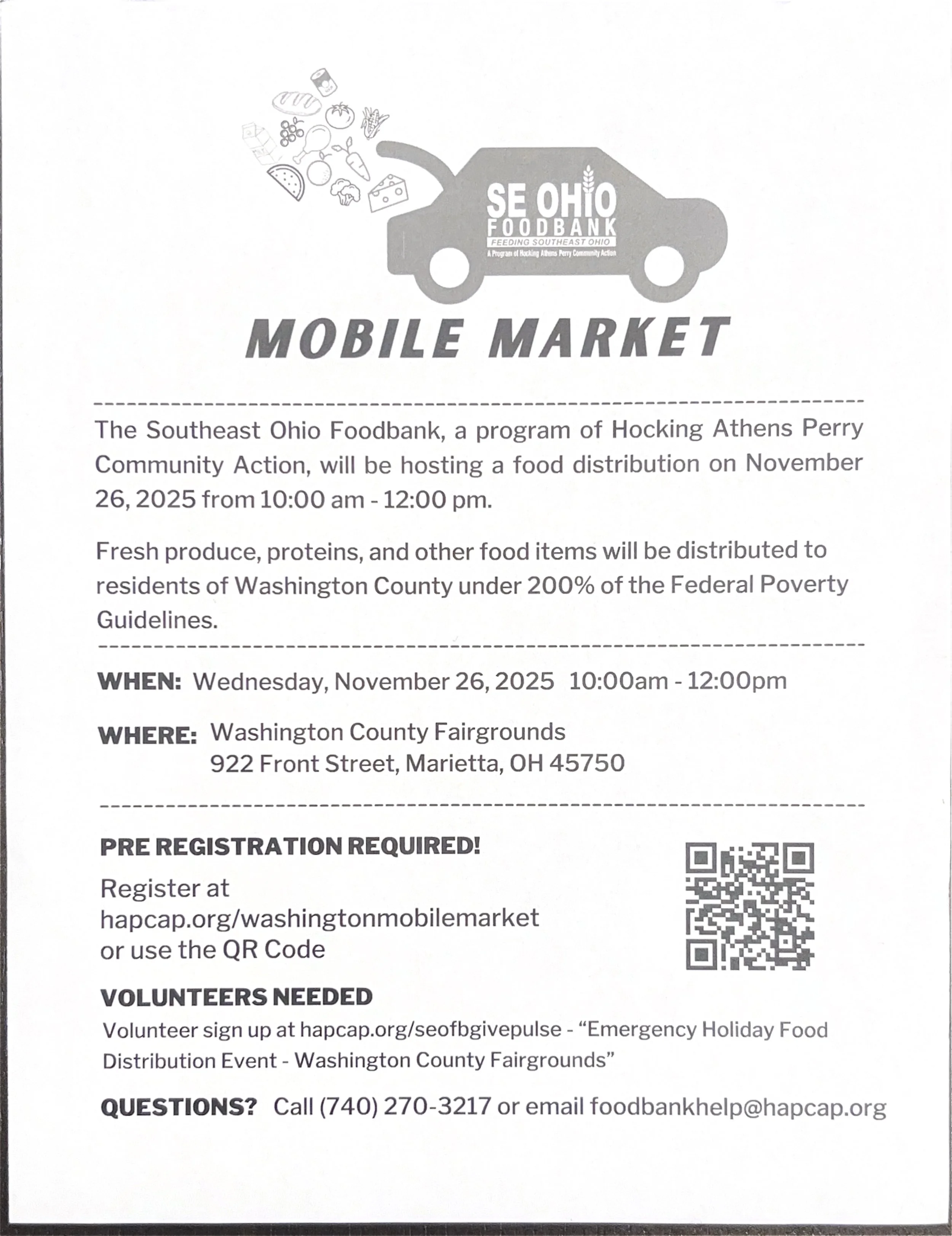 The Southeast Ohio Foodbank, a program of Hocking Athens Perry Community Action, will host a food distribution on November 26 from 10:00am to 12:00pm.