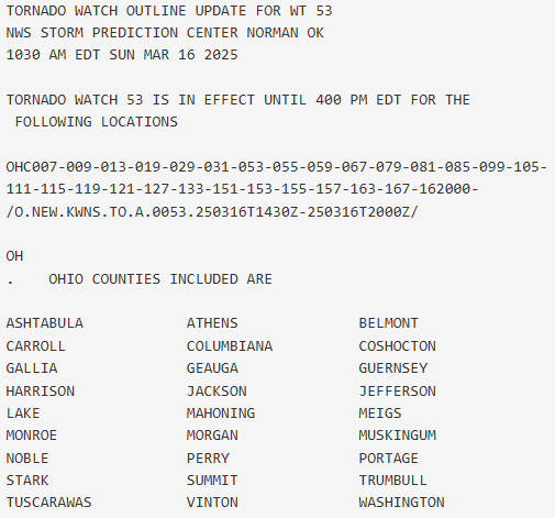 On March 16th at 10:30am, The National Weather Service in Charleston, WV has issued a tornado watch for our area in effect until 4pm this afternoon.